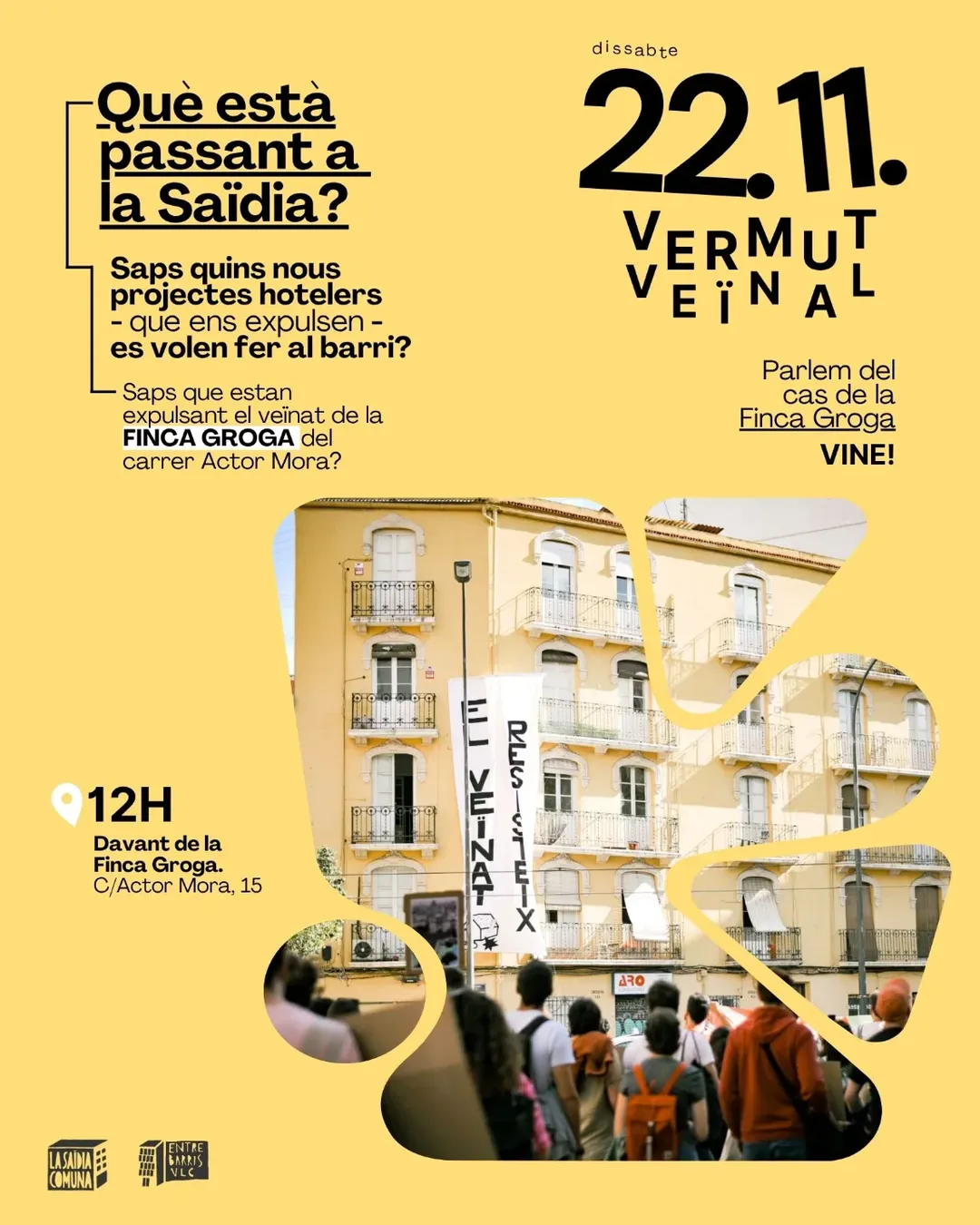 T’ho contem tot el dissabte 22 de novembre, davant d’un dels edificis afectats: 📍la Finca Groga (C/ Actor Mora, 15).